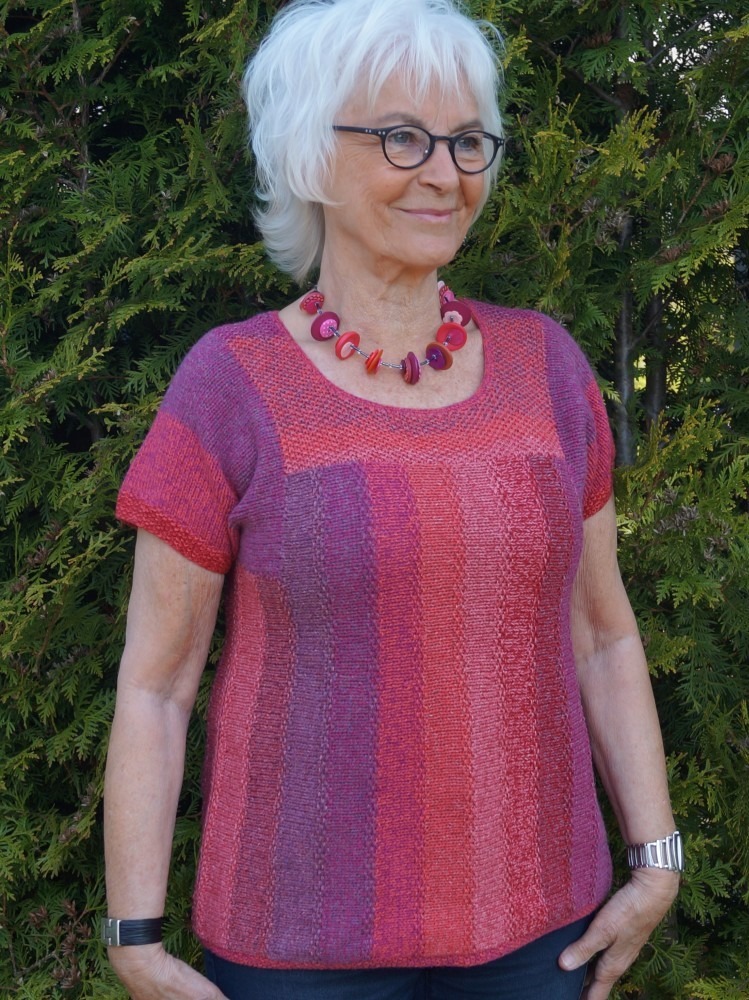 Striped sweater in moss stitch with a slight A-line