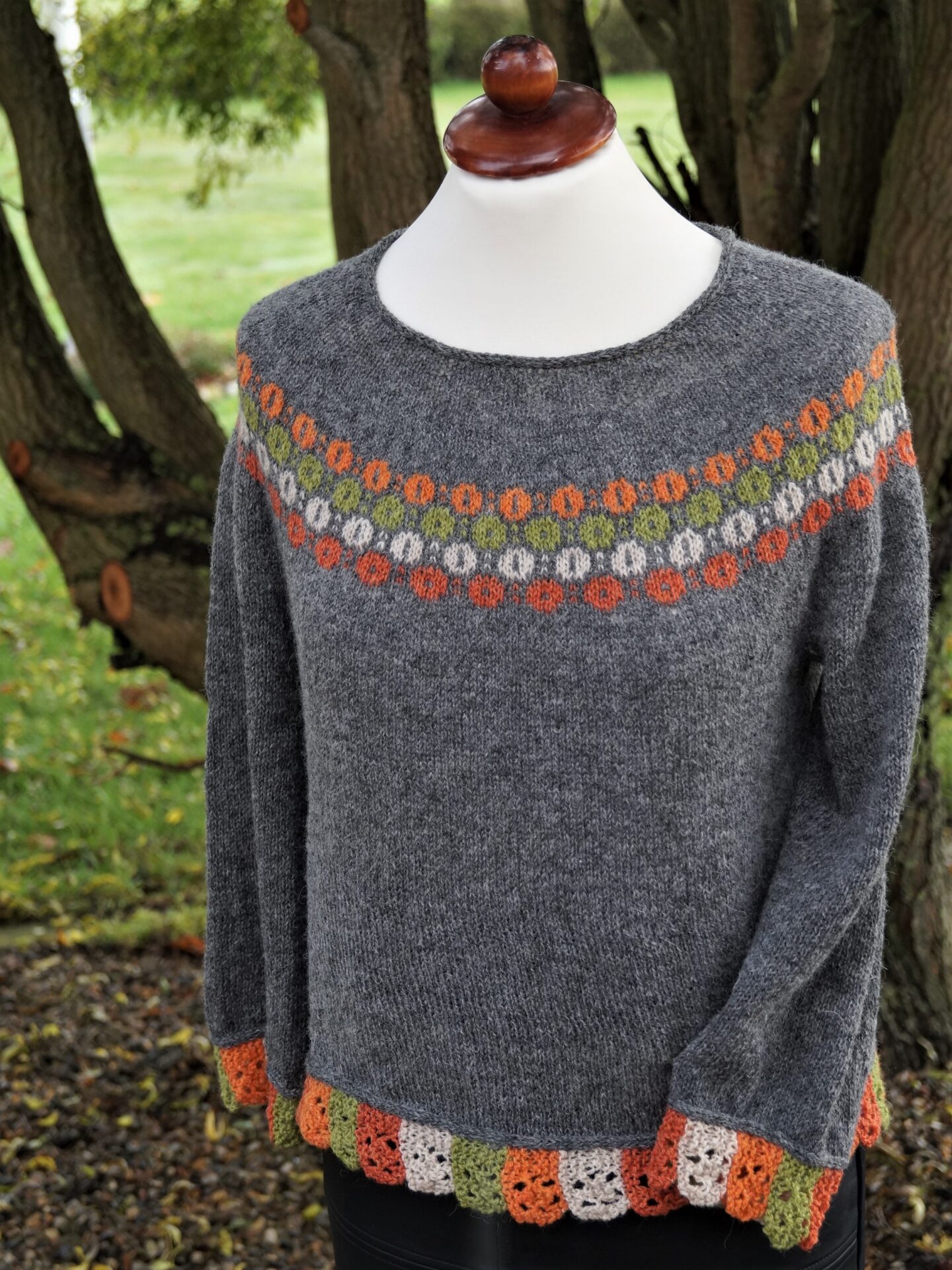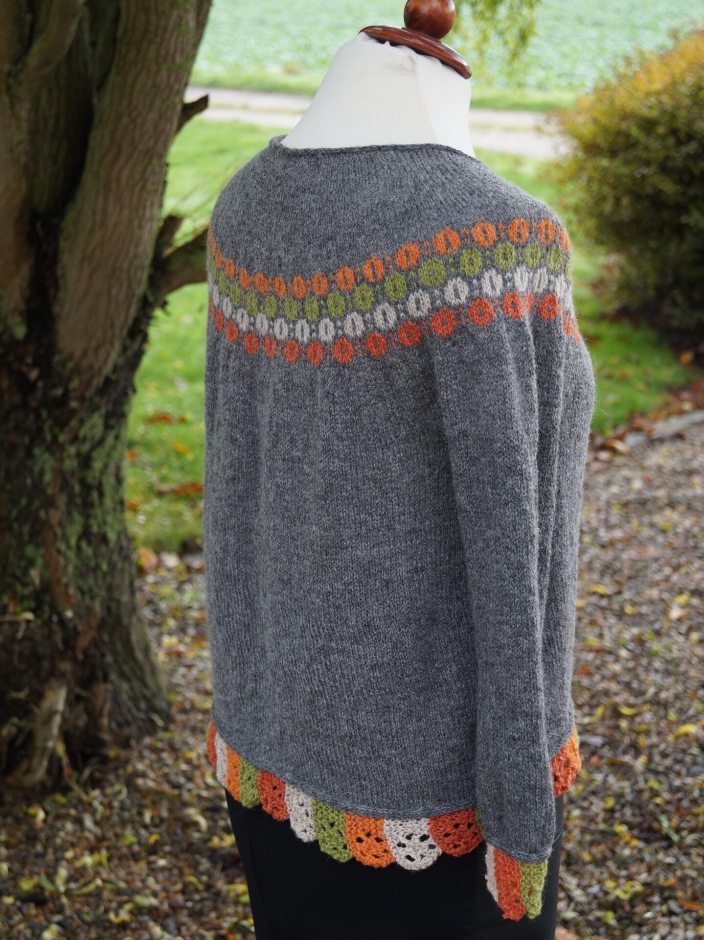 Kort rundpind 3,5 til hals og ærmer, længere rundpind 3,5 efterhånden som arbejdet skrider frem