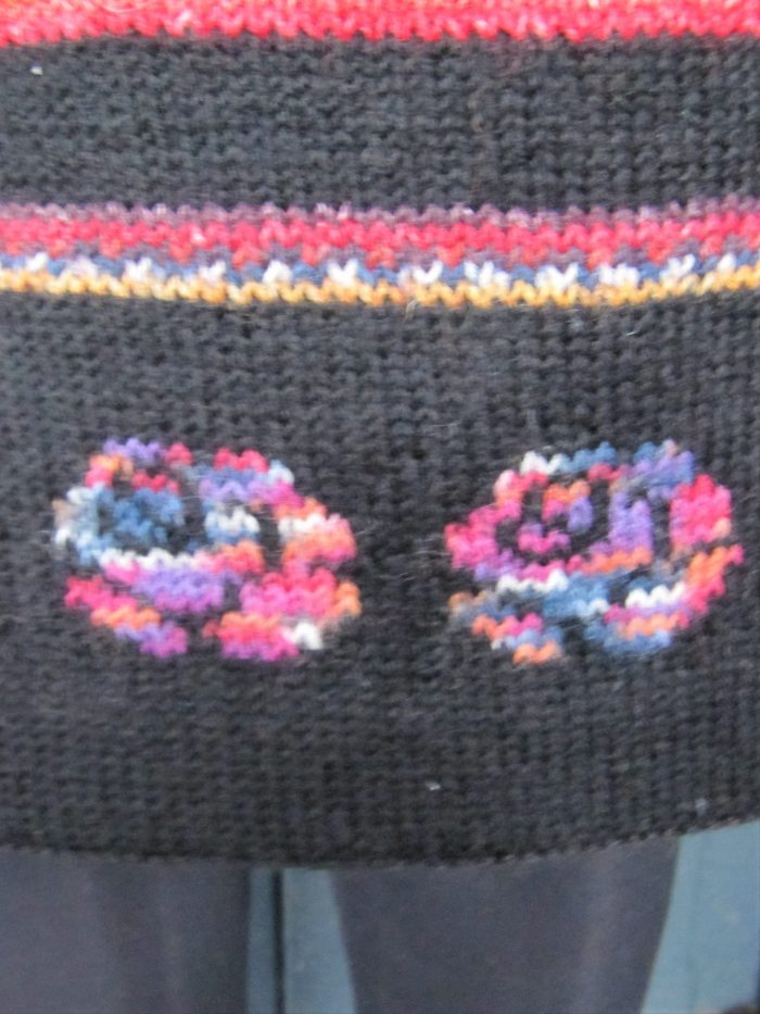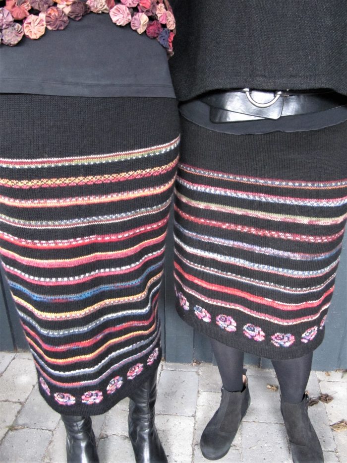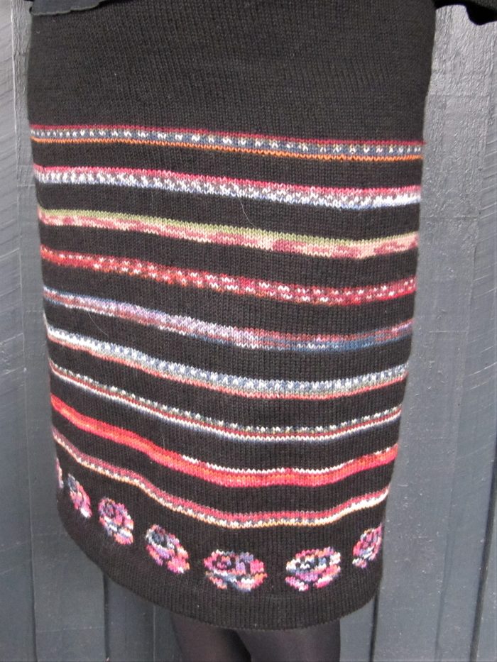 Materiale: 3 – 6 nøgler (50 gr) sort strømpegarn, afhængig af længde og størrelse på nederdel. Små rester af flerfarvede strømpegarn. Man kan evt. nøjes med 1 -2 nøgler med flerfarvet garn
