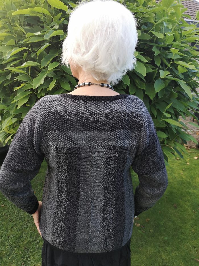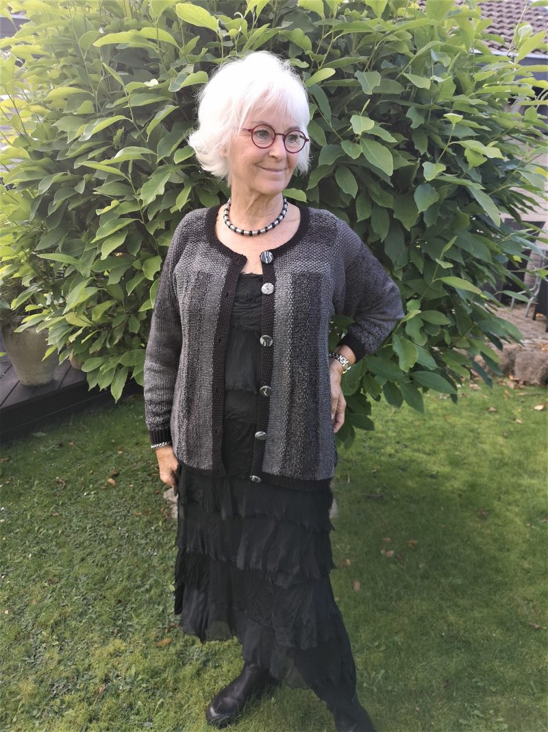 Materiale: Coast garn 55 % lammeuld/45 % bomuld- strikket med dobbelt garn på p 4,5