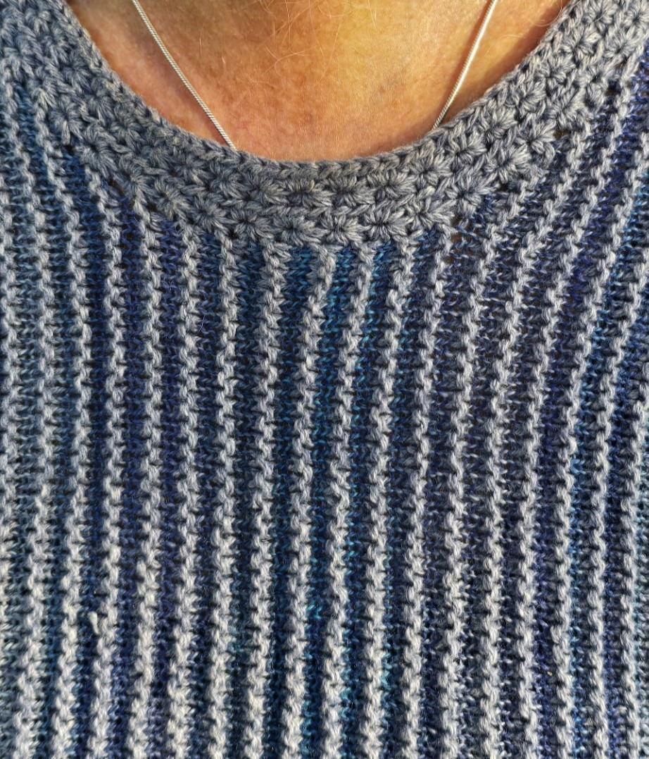Strikkefasthed på pind 3,5 er 24 m x 42 = 10 x 10 cm i blusens mønster