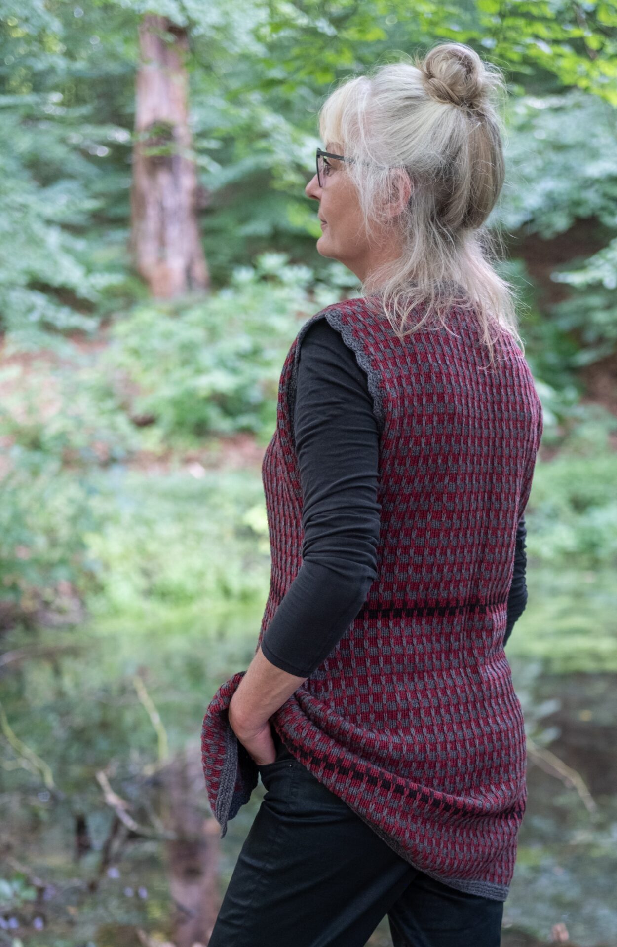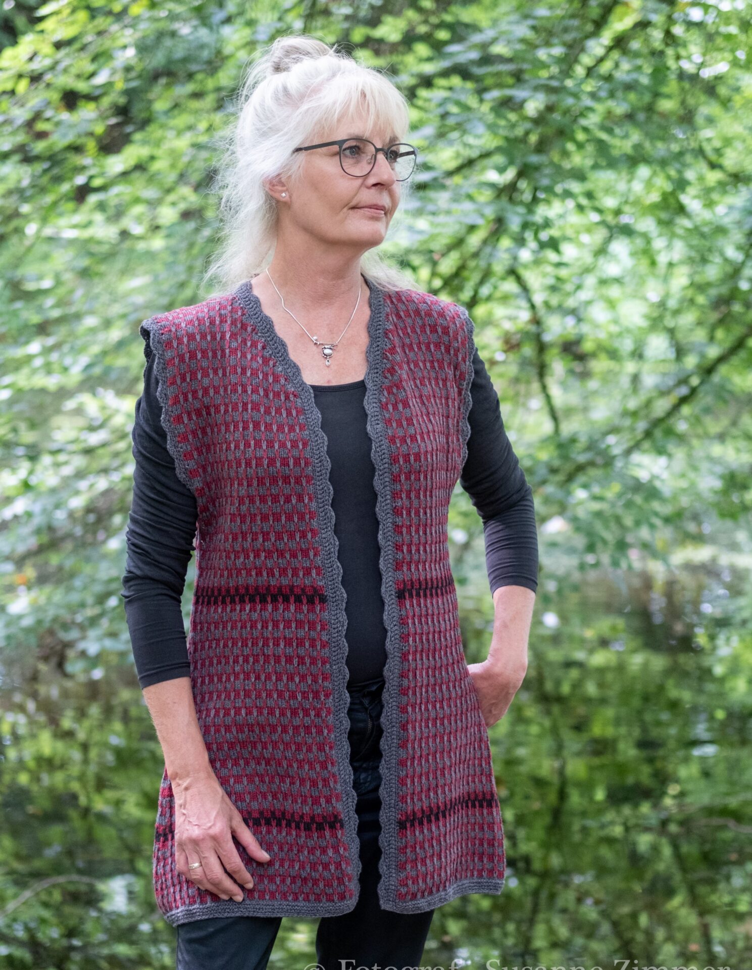 A-formet lang vest strikket i vævestrik med hæklet kanter